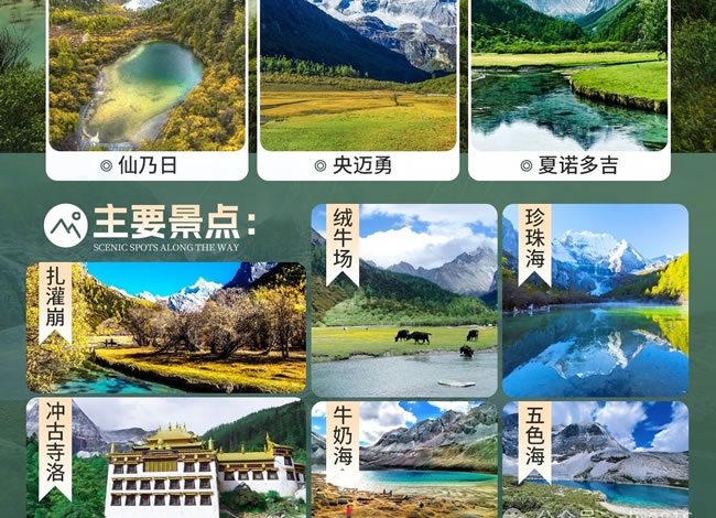 早上:7:00 早餐后乘車(chē)經(jīng)波瓦山到達(dá)【亞丁景區(qū)】(門(mén)票已含,首次觀(guān)光車(chē) 120/人自理,必須消費(fèi)),后在游客接待中心換乘景區(qū)觀(guān)光車(chē)抵達(dá)亞丁景區(qū)【扎灌崩】(40 公里,車(chē)程 1.5 小時(shí)),下車(chē)后游 客徒步上山直接抵達(dá)沖古寺。 中午:景區(qū)中餐自理,觀(guān)賞沖古寺風(fēng)光及神山仙乃日風(fēng)光,然后可自費(fèi)乘坐電瓶車(chē)(自理往返 70/人,單程 40/人)前往【洛絨牛場(chǎng)】(如徒步需 1-2 小時(shí)左右達(dá)到洛絨牛場(chǎng))。這里是觀(guān)【夏諾多吉神山】(意為金剛手菩薩,海拔 5958 米)【央邁勇神山】(意為金文殊菩薩,海拔 5958 米)的最佳地點(diǎn),讓神山圣水與心共鳴,盡情沉醉在夢(mèng)幻之地,后原路返回,到達(dá)【扎罐崩】乘觀(guān)光車(chē)返回住宿地。 晚上:回到日瓦鎮(zhèn)或稻城,晚餐后入住酒店。溫馨提示:因當(dāng)天游客出景區(qū)時(shí)間不統(tǒng)一,所以旅游車(chē)無(wú)法統(tǒng)一接送游客,游客可以選擇乘坐當(dāng)?shù)毓卉?chē)(5-10元/人自理)。亞丁景區(qū)分長(zhǎng)線(xiàn)—牛奶海、五色海和短線(xiàn)—珍珠海游覽。長(zhǎng)線(xiàn)游覽:因牛奶海和五色海海拔高,客人務(wù)必根據(jù)自身實(shí)際情況選擇是否前往(可選擇自費(fèi)騎馬305元/人至舍身崖約1.5小時(shí),再徒步至牛奶海和五色海需約1.5小時(shí),冬季11中旬至次年3約中旬馬幫停運(yùn),需徒步單程5KM往返10KM,徒步往返時(shí)間約4.5小時(shí))到達(dá)【牛奶?!?,再徒步前往【五色?!浚ㄍ讲郊s20分鐘);【牛奶?!亢0?800米,又叫洛絨措,古冰川湖,狀如水滴,四周雪山環(huán)繞,湖水清瑩碧藍(lán),山止成瀑,以其玲瓏秀雅水色翠藍(lán)而著名。牛奶海在央邁勇的山坳里,呈扇貝形,中間是碧藍(lán)的雪水,周邊則是一圈乳白色環(huán)繞,這圈乳白色大致就是牛奶海名稱(chēng)的由來(lái)。牛奶海是美麗的,遠(yuǎn)遠(yuǎn)望去,仿佛碧玉鑲嵌在雪山之中,純凈安詳。純凈的湖水給人以平和安寧的心境,而藍(lán)湛湛的海子并不透明,顯得神秘莫測(cè)。傳說(shuō)能治聾啞病的圣湖?!疚迳!亢0?600米,由于光的折射下,產(chǎn)生五種不同顏色而得名:其真名為“登崇措”。五色海它位于仙乃日與央邁勇之間,湖面呈圓形。面積0.7公頃,現(xiàn)代冰谷下伸至湖畔,雪山倒影湖面,呈現(xiàn)奇幻的色彩。是藏區(qū)著名的圣湖(佛經(jīng)中贊譽(yù)該湖與西藏羊巴雍措齊名),據(jù)傳能“返演歷史,預(yù)測(cè)未來(lái)”。短線(xiàn)游覽:游客可乘坐景區(qū)觀(guān)光車(chē)抵達(dá)扎灌崩,徒步500米到達(dá)沖古寺,前往仙乃日神山下的圣湖【珍珠海】短線(xiàn)游覽(單程約1.5KM,徒步前往約40分鐘),海拔3950米?!菊渲楹!吭诓卣Z(yǔ)中稱(chēng)為“卓瑪拉措”,是仙乃日的融雪形成的海子。面積約0.1平方公里。密林中的珍珠海如一顆鑲嵌在蓮花寶座上的綠寶石,碧波蕩漾,粼粼波光中透出無(wú)限清麗,湖畔四周,參翠如屏。春天湖邊片片杜鵑花燦爛怒放,秋天層林盡染,倒影著五彩斑斕的世界,令人目眩神迷?!緛喍【皡^(qū)】以仙乃日、央邁勇、夏諾多吉三座雪峰為核心區(qū),北南向分布,三座雪山呈品字形,三峰藏名為“念青貢嘎日松貢布”,意為“三怙主雪山”,是眾生朝圣積德之所在地。由于特殊的地理環(huán)境和自然氣候,形成了獨(dú)特的地貌和自然景觀(guān),是中國(guó)保存最完整的一處自然生態(tài)系統(tǒng)。