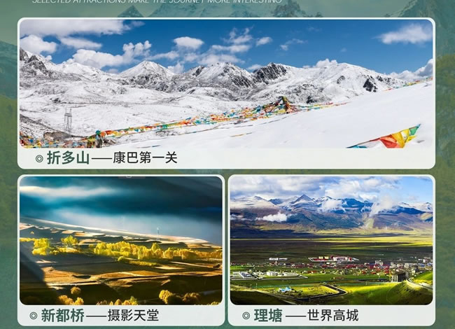 早上:集合地點(diǎn)統(tǒng)一出發(fā),出發(fā)時(shí)間以師傅/導(dǎo)游通知為準(zhǔn),從成綿高速、成雅高速經(jīng)雨城【雅安】(以雅女、雅魚(yú)、雅雨三絕而聞名是川藏、青藏的咽喉,也是古南方絲綢之路和茶馬古道的門(mén)戶(hù)必經(jīng)之路)。下高速后沿秀美青衣江而上,觀(guān)青衣江河谷風(fēng)光。中午:經(jīng)雅康高速一路向西,經(jīng)過(guò)【二郞山】隧道,欣賞“一山有陰陽(yáng)”的兩種截然不同的奇觀(guān),遠(yuǎn)眺大渡河風(fēng)光(川西最大最深峽谷),后經(jīng)情歌故鄉(xiāng)【康定】午餐,海拔 2560 米。然后乘車(chē)前往有小九寨之稱(chēng)的4A級(jí)風(fēng)景區(qū)-【康定情歌風(fēng)景區(qū)】(又名木格措風(fēng)景區(qū),門(mén)票贈(zèng)送,觀(guān)光車(chē)90元/人自理,必須消費(fèi)), 它坐落于貢嘎山脈中段,附近有其他多個(gè)高山湖泊和溫泉,原始森林,草原和雪山景觀(guān)互相交融。景區(qū)由木格措圣湖、杜鵑峽、藥池沸泉、七色海、芳草坪等景點(diǎn)組成。木格措湖景色一日多變,清晨坦面無(wú)垠的湖面靜如鏡面,倒映著雪峰和群山;午后波濤滾滾,濤聲如雷震撼山谷;傍晚夕陽(yáng)西斜時(shí)湖面金光燦爛奪目。動(dòng)靜交替的湖水,日變?nèi)f千。在此還可觀(guān)賞到“猛虎臥山”、“觀(guān)音鎮(zhèn)?!钡绕婷钌骄啊T诓煌竟?jié)還可欣賞“雙霧墜?!薄ⅰ澳靖裣φ铡?、“木格漲潮”和迭瀑飛泉等云、霧、霞、水奇觀(guān);在珍珠灘可享受沙浴、日光浴之樂(lè)。海濱可享沙浴、日光浴之樂(lè),湖中可乘坐游船(游船66元/人、游客可以根據(jù)自身情況自費(fèi)乘坐游覽)。七色海是一處湖水與溫泉交融的高原湖泊,杜鵑峽是木格措景區(qū)的走廊,藥池沸泉泉眼數(shù)十個(gè),景區(qū)以高山湖泊及溫泉為主要特色,融原始森林、草原、雪山為一體,互相映襯,一派原始古樸而幽靜的自然景色。木格措圣湖是川西北最大的高山湖泊之一,整個(gè)風(fēng)景區(qū)以圣湖、溫泉、雪山、草原、彩林、瀑布為主要特色,一派原始古樸而幽靜的自然景色,使人們仿佛置身于“瑤池仙境”。后翻越有“康巴第一關(guān)”的塞外屏障【折多山】,最高峰海拔 4900 米,埡口海拔 4298 米,也是川藏線(xiàn)上第一個(gè)需要翻越的高山埡口。至令人神往的“光與影的世界”“攝影家的天堂”【新都橋】。晚上:晚餐后入住新都橋/雅江酒店。游客若有需要可自行前往網(wǎng)紅打卡景點(diǎn)-【魚(yú)子西】(參考價(jià)格:小車(chē)擺渡費(fèi)60-80/人+清潔費(fèi)30/人請(qǐng)自理)屬于木雅貢嘎地區(qū),擁有以藏傳佛教為基礎(chǔ)的基本文化特征,項(xiàng)目范圍內(nèi)可 360 度遙望藏區(qū)四大神山之一藏區(qū)“第二香巴拉”的雅 拉神山全貌和四川最高峰“蜀山之王”的木雅貢嘎大雪山山系全貌,為貢嘎西坡地區(qū)難得的觀(guān)景攝影點(diǎn)。后帶著愉悅的心情乘車(chē)返回有攝影天堂之稱(chēng)的【新都橋】。